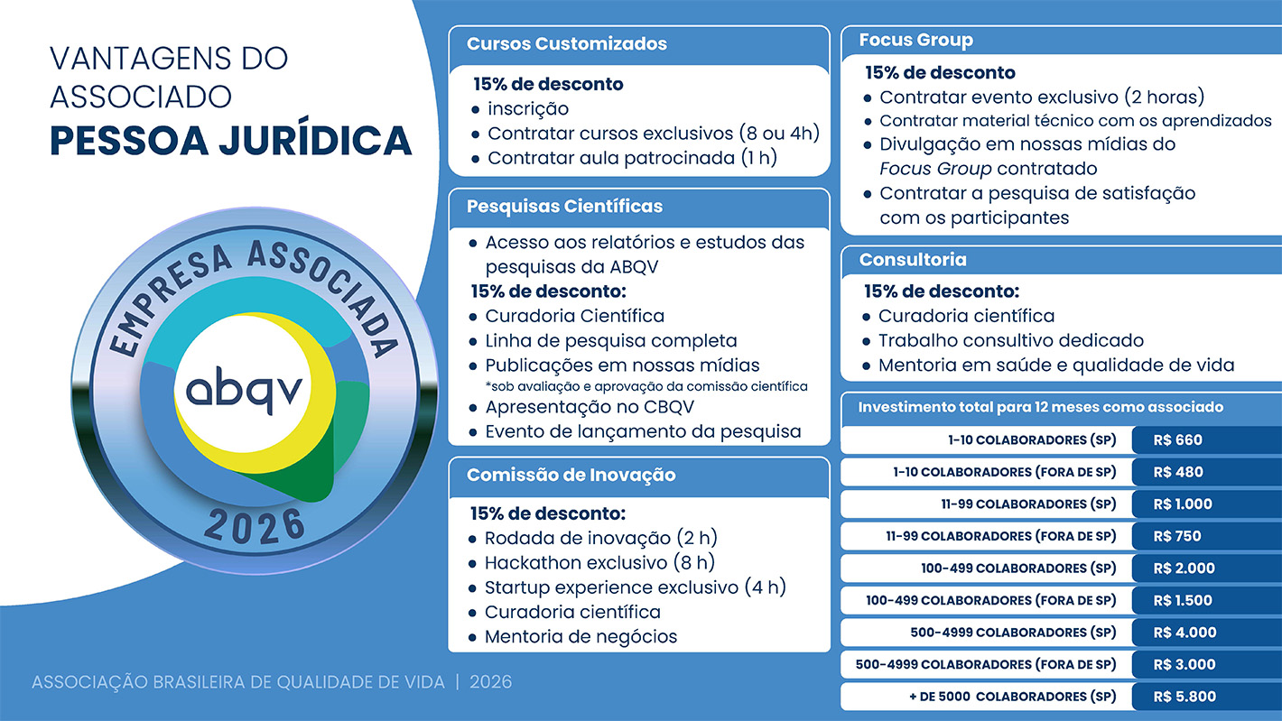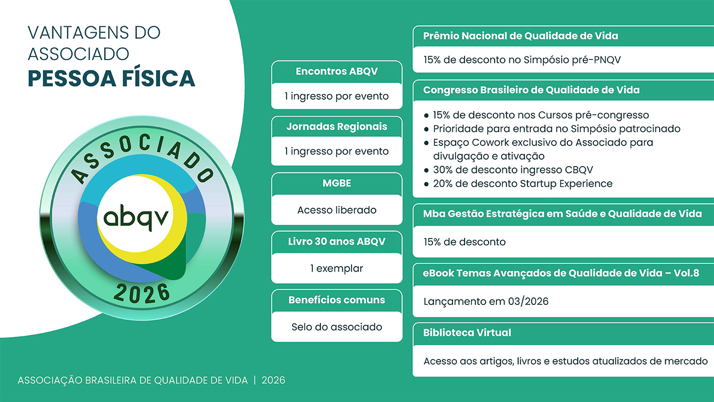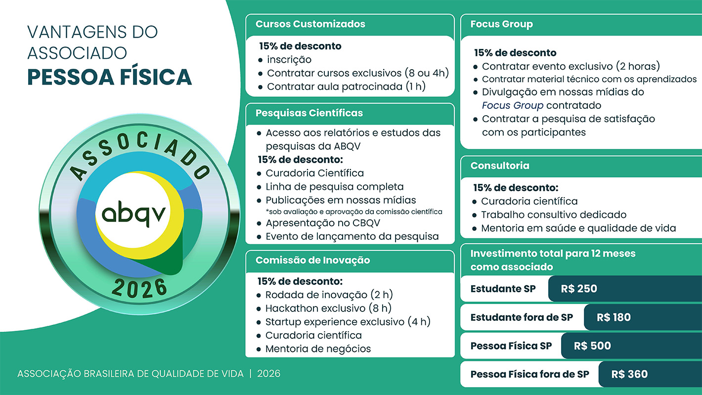 Ao se tornar associado, você terá descontos especiais nas ações promovidas pela ABQV, como encontros mensais, cursos, além do Congresso Brasileiro de Qualidade de Vida e a nossa tradicional especialização em parceria com a Associação Paulista de Medicina (APM) e com o Instituto de Ensino Superior da APM (IESAPM)