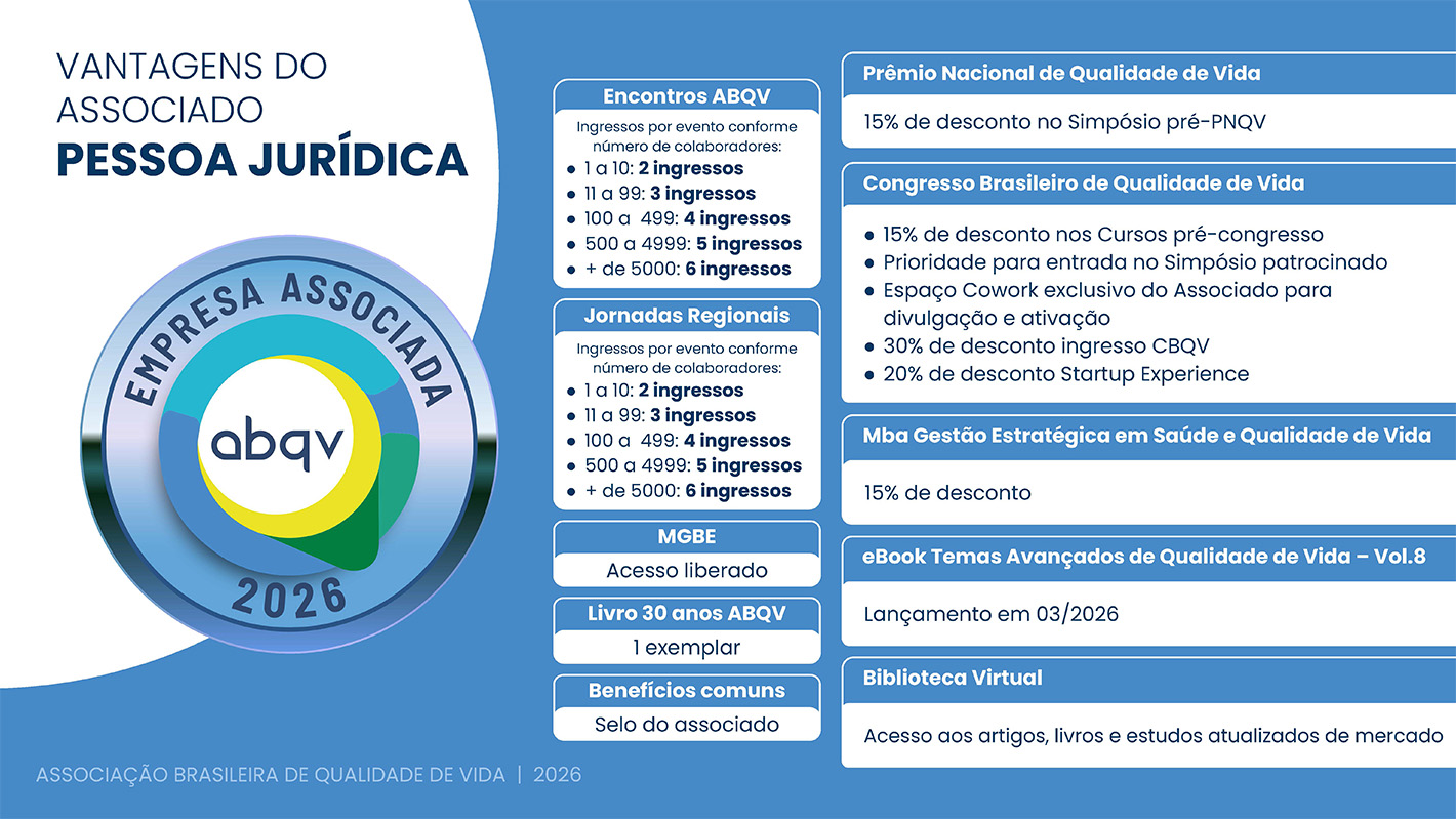 A ABQV é a mais antiga e mais renomada associação em prol da qualidade de vida nas organizações. Ser associado significa estar entre grandes especialistas no assunto e receber informações em primeira mão que podem ajudá-lo na gestão nas áreas de RH, Saúde e Segurança no Trabalho dentro da sua organização.